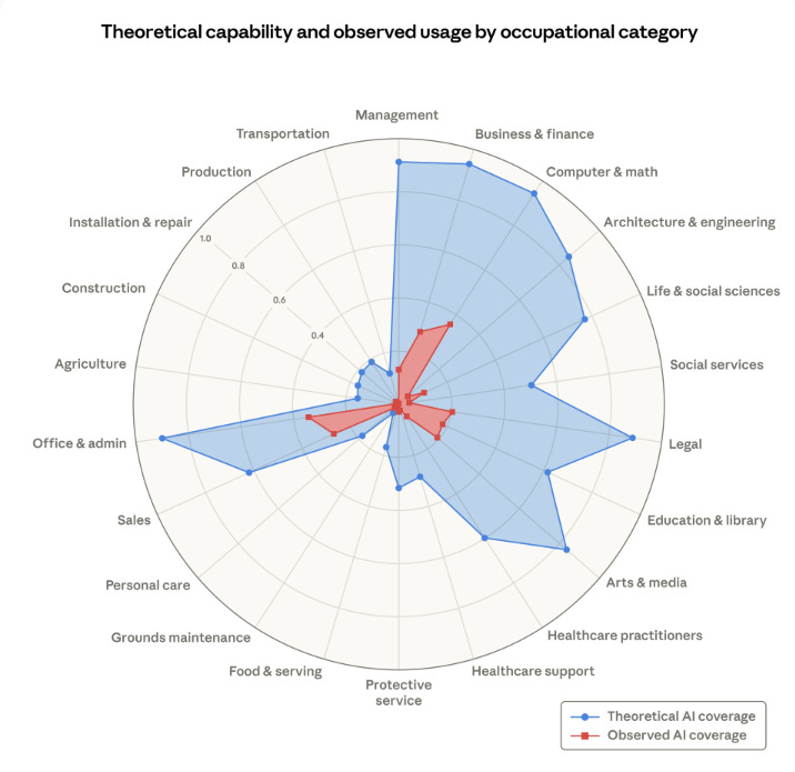 Anthropic (the company behind Claude) just published research on how AI is actually showing up across different jobs. They mapped it out and it looks like a web, touching everything from programming to customer service to data entry. Computer programming tasks? AI is already handling 75% of them. And here’s the part that stuck with me: they found that hiring of younger workers is starting to slow down in the jobs most exposed to AI. That’s our kids’ future we’re looking at.